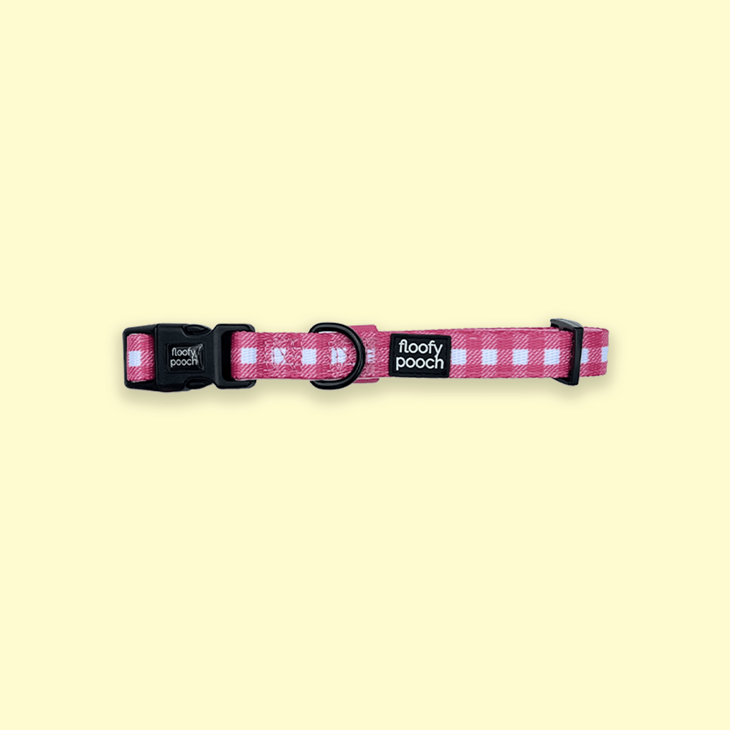 Brighten your dog's day with our fun, colorful collars designed for both flair and safety. Meticulously crafted, these lively hues ensure your furry friend stands out, while the robust build guarantees comfort and security on every adventure. Let your pup shine and stay secure with our collars! Featuring a berry pink gingham pattern, for the sweetest pooch.